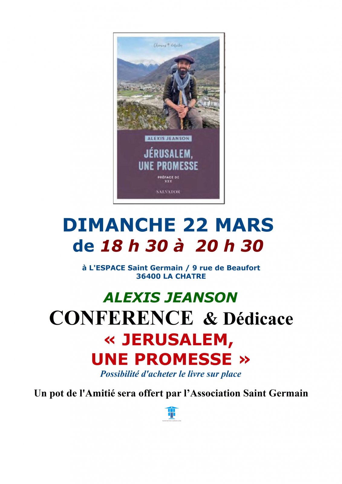 L'Association Saint Germain de La Châtre vous invite à une soirée autour du livre "Jérusalem, une Promesse" d'Alexis Jeanson.